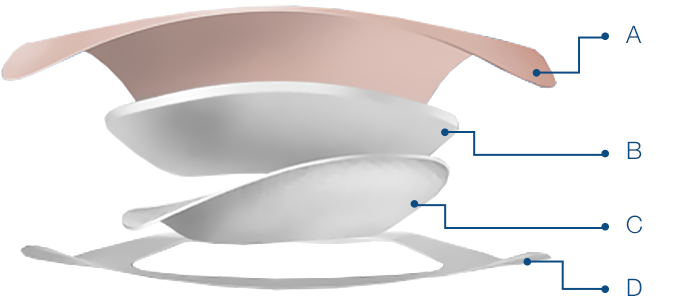 - Uma almofada de espuma macia e absorvente para aumentar o conforto do paciente e absorver o excesso de exsudado.