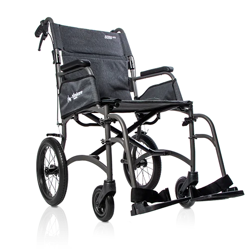 Available in three seat widths — 40 cm, 42 cm, and 45 cm — it adapts to the individual needs of users. The attendant hand brake system offers enhanced safety and comfort for both the user and the caregiver.