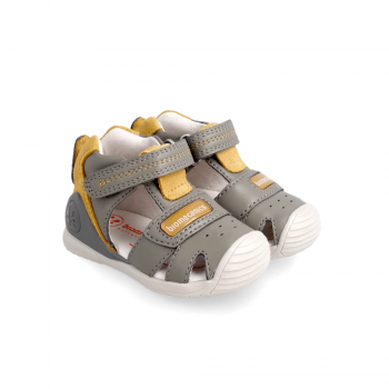 Sandal with adjustable velcro closure and reinforced toe cap. A comfortable and versatile shoe for your baby's first steps that you can wear at any time.